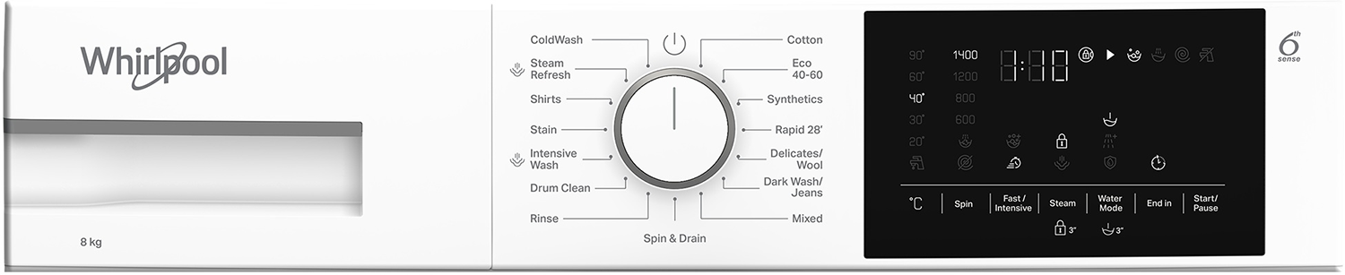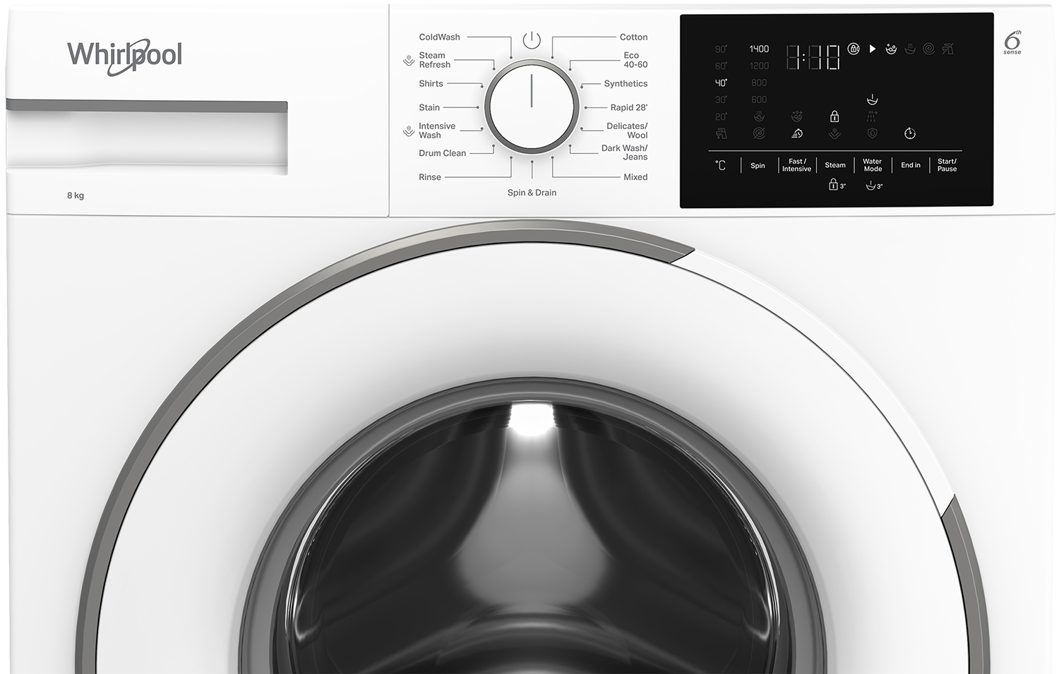 Whirlpoolin 6th SENSE -sensoritekniikka mukauttaa pesuolosuhteet automaattisesti pyykkimäärän ja materiaalin mukaan, mikä säästää vettä ja energiaa. Digitaalinen näyttö, elektroninen ohjauspaneeli ja ajastintoiminto tekevät käytöstä vaivatonta. Kompaktit mitat (845 x 598 x 550 mm) ja kevyt rakenne helpottavat sijoittamista kodin eri tiloihin.