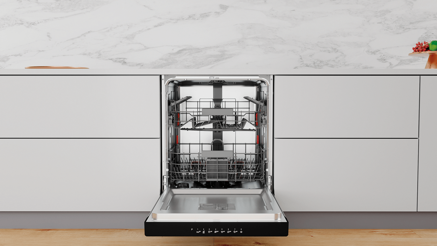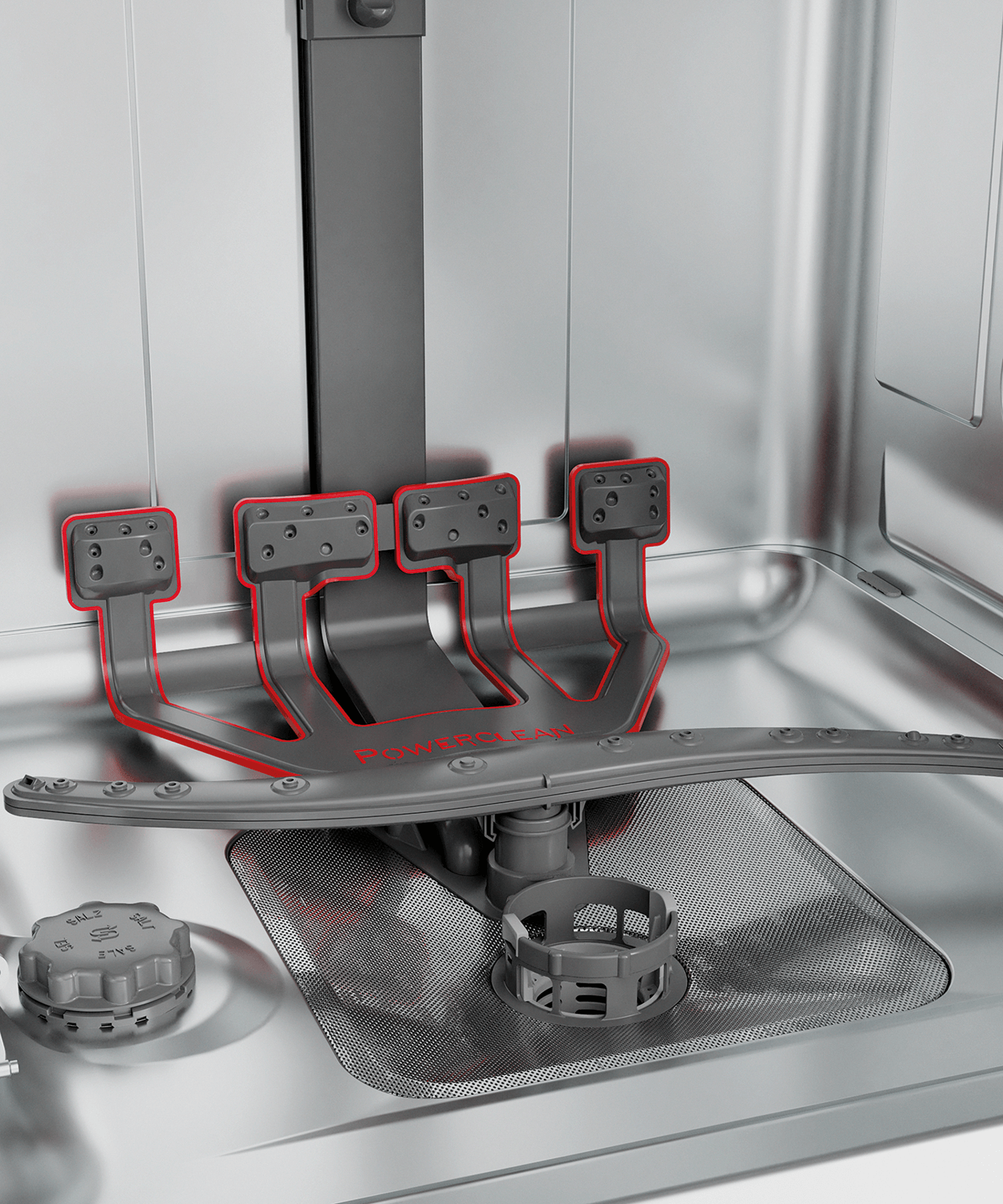 PowerClean: astioita ei tarvitse liottaa, ei huuhdella, eikä likaa hangata ennen koneeseen laittoa. Koneen takaosassa sijaitseva PowerClean puhdistaa kiinni palaneen lian pannuista ja kattiloista käyttäen 32 korkeapainesuihkua. Toiminto ei kuluta normaali enempää vettä. Valitse vain PowerClean -toiminto, aseta likaiset pannut ja kattilat alakorin takaosaan, jotta korkeapainesuihkut osuvat niihin kunnolla, ja anna PowerCleanin hoitaa loput.