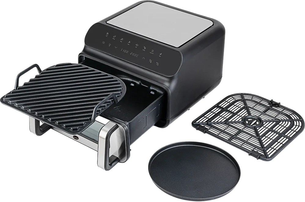 Dualfry Grill 10L kiertoilmakypsentimessä on grillitoiminto. Korkea lämpötila ja valurautainen grillialusta takaavat täydellisen grillauspinnan.