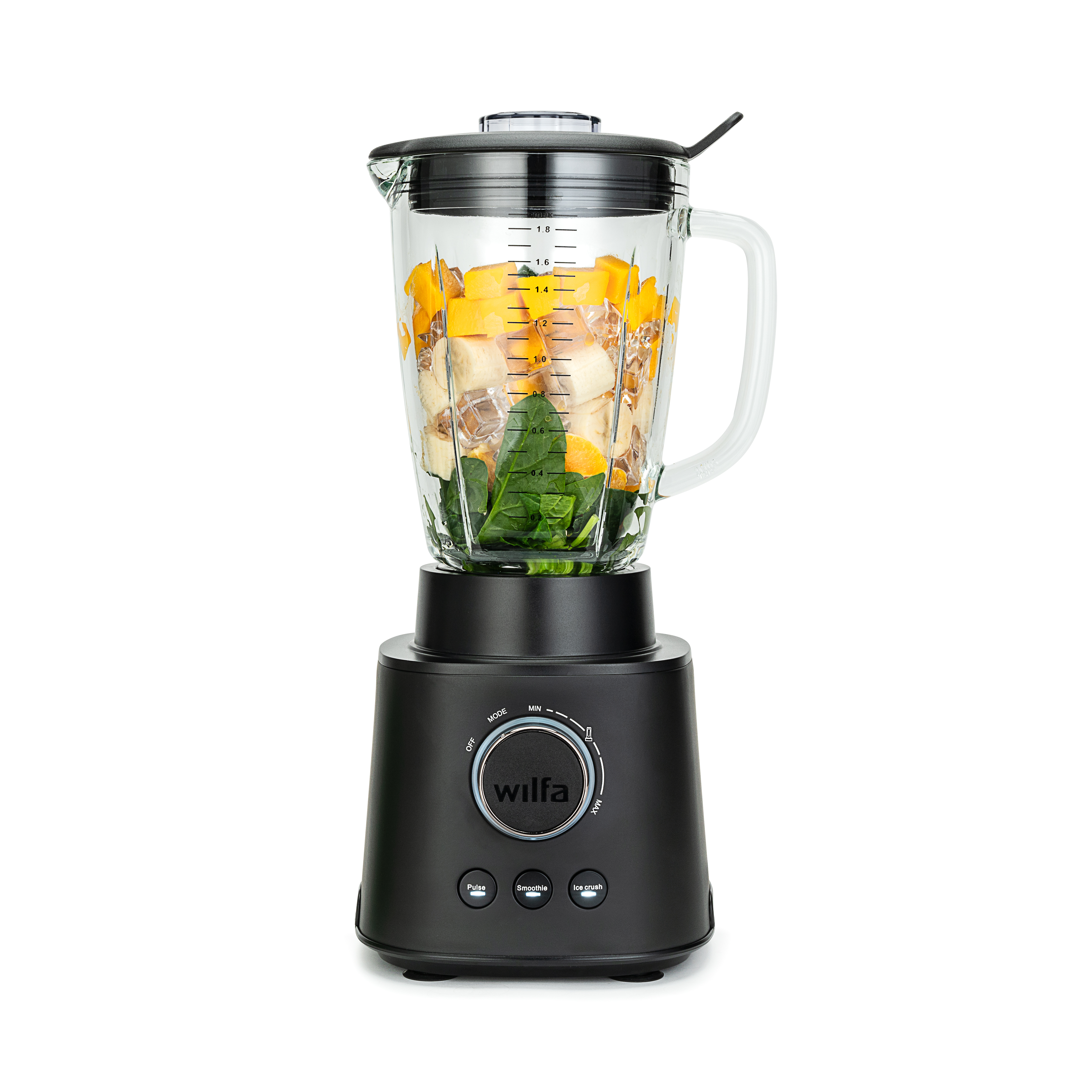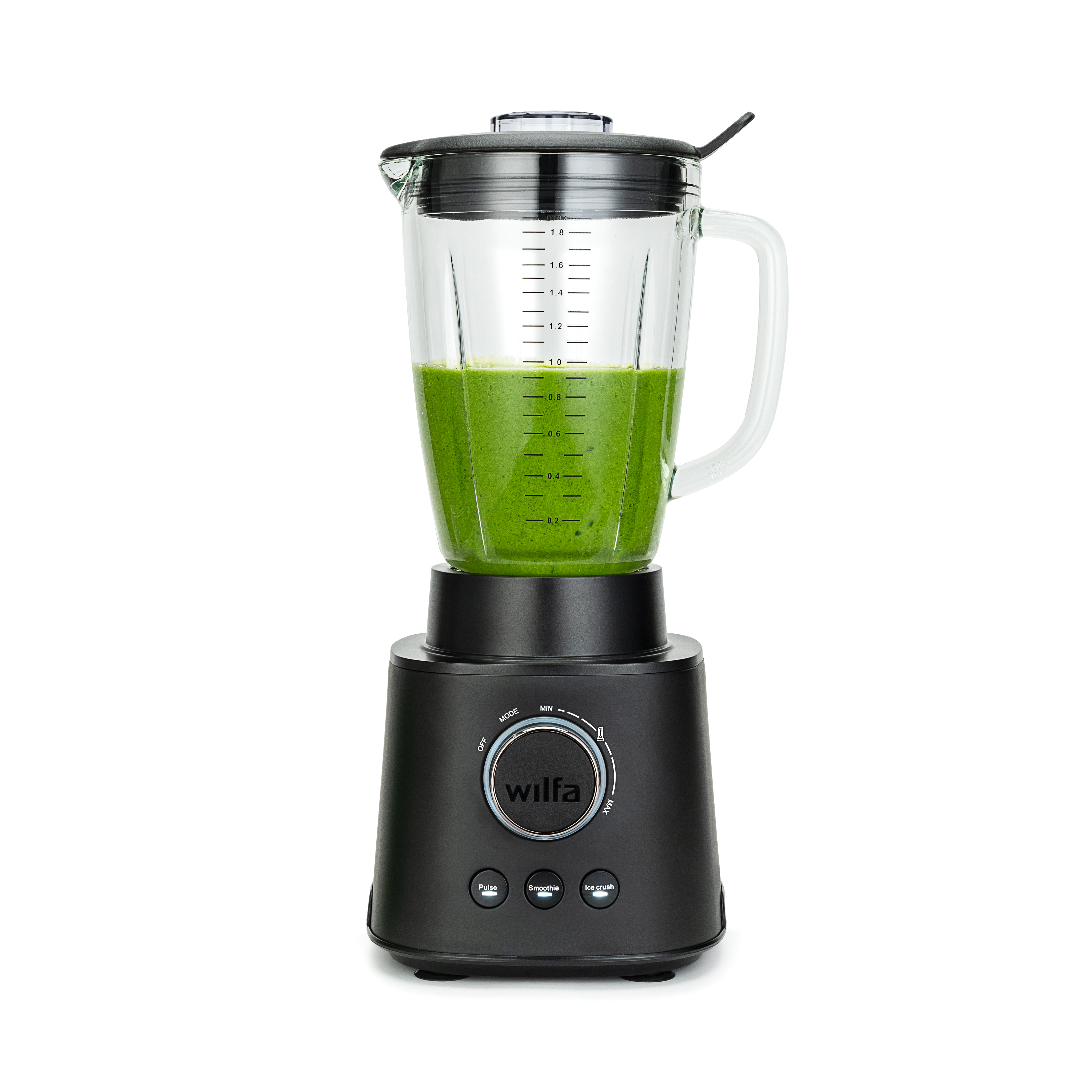 Essential 1800 Auto tehosekoittimen kannun tilavuus on 1,8L, joten se riittää valmistamaan smoothiet koko perheelle.