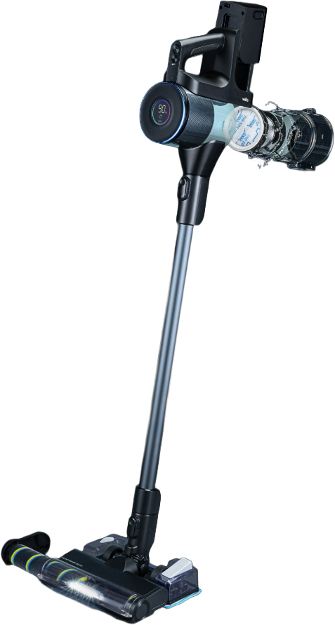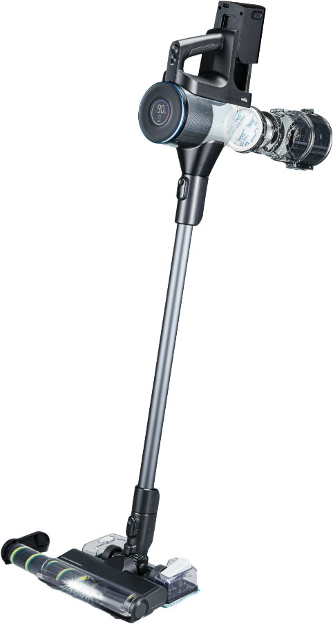 Kevyt rakenne ja helppo käsiteltävyys Imurin paino on vain 2,75 kg, ja ergonomisesti muotoiltu kahva tekee käytöstä miellyttävää. Käynnistys tapahtuu yhdellä painalluksella ilman tarvetta pitää nappia pohjassa. Lattiasuulakkeessa oleva kirkas LED-valo paljastaa pölyn myös hämäristä nurkista, mikä tekee siivouksesta tarkkaa ja tehokasta.