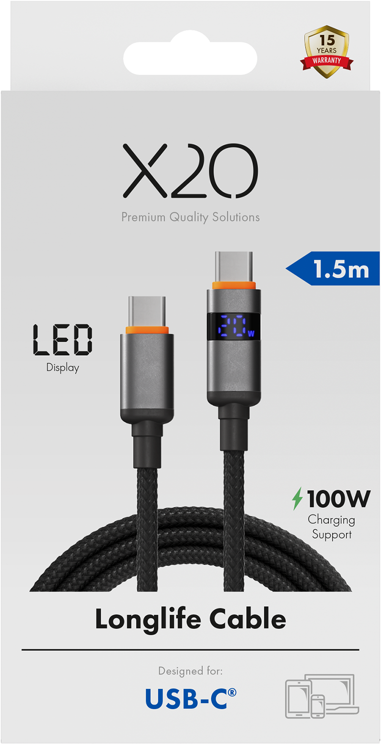 X2O Longlife 100W PD USB-C to USB-C 1,5 m kaapeli LED-näytöllä