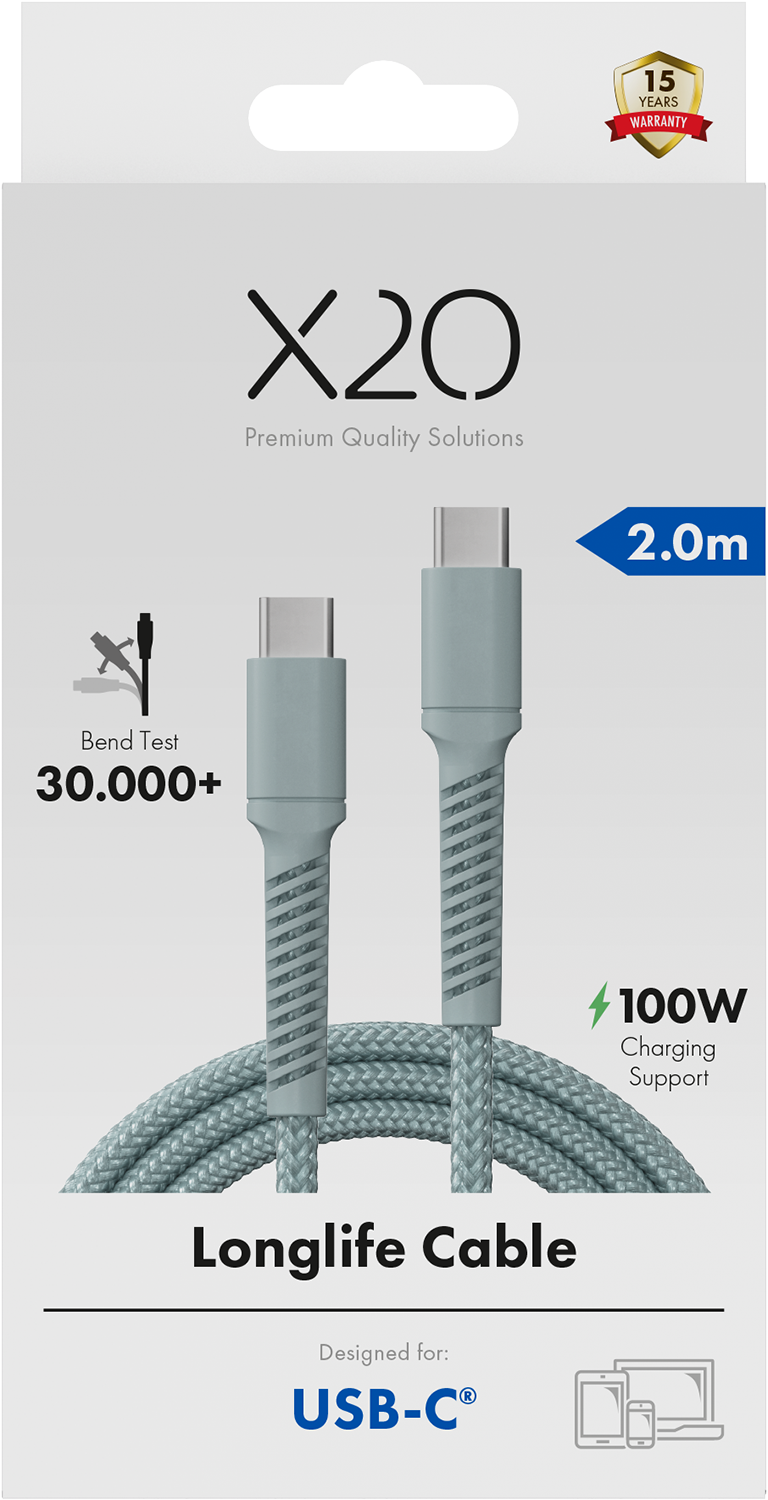 X2O Longlife 100 W -kaapeli yhdistävät nopean lataamisen sekä kestävän ja pitkäikäisen rakenteen. Punottu nailon tekee kaapelista kestävän kovaan käyttöön pitkään. Metallikotelolla, taivutussuojalla ja nikkelipinnoituksella varustettujen kestävien liittimien ansiosta tämä kaapeli kestää jatkuvaa kytkemistä ja irrottamista.