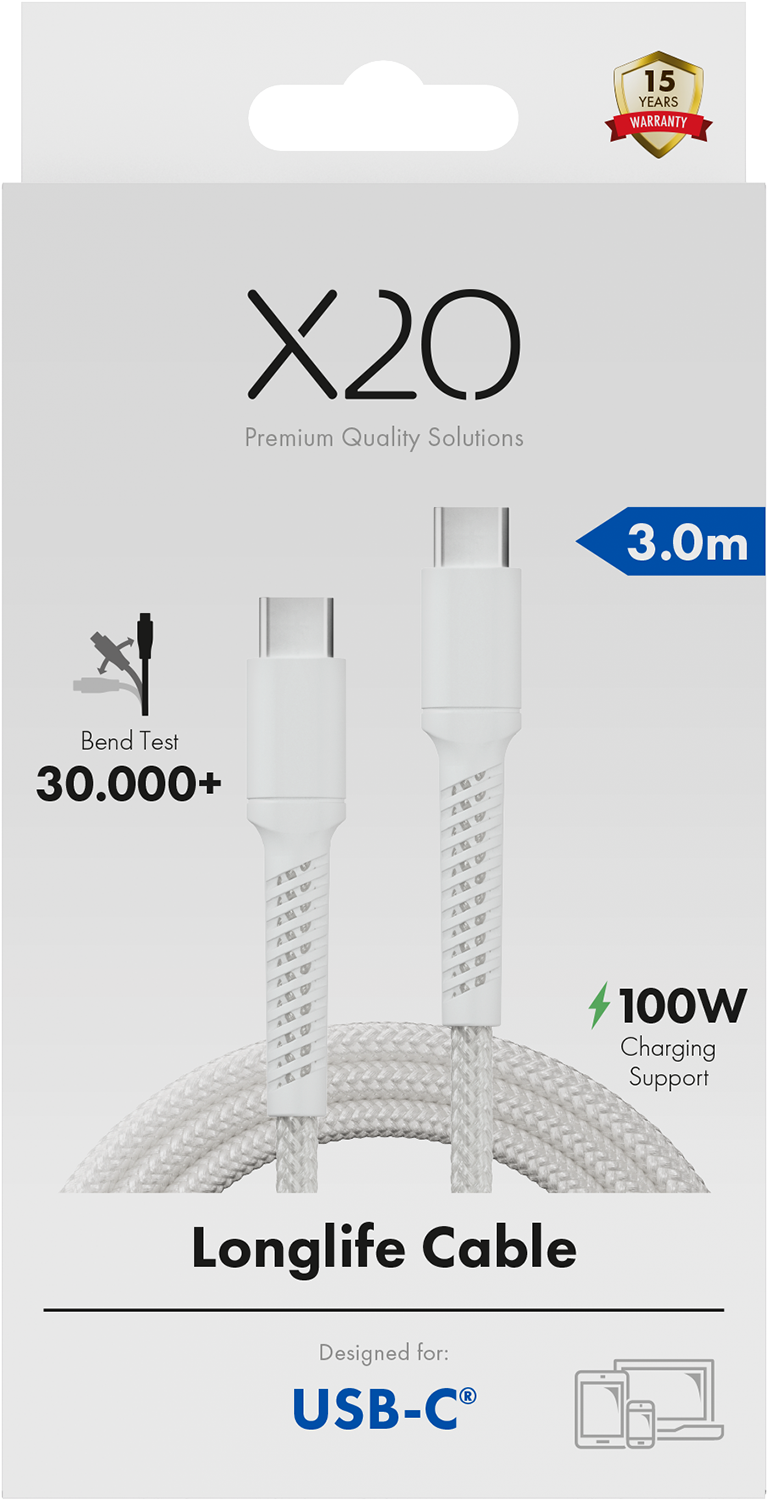 X2O Longlife 100 W -kaapeli yhdistävät nopean lataamisen sekä kestävän ja pitkäikäisen rakenteen. Punottu nailon tekee kaapelista kestävän kovaan käyttöön pitkään. Metallikotelolla, taivutussuojalla ja nikkelipinnoituksella varustettujen kestävien liittimien ansiosta tämä kaapeli kestää jatkuvaa kytkemistä ja irrottamista.
