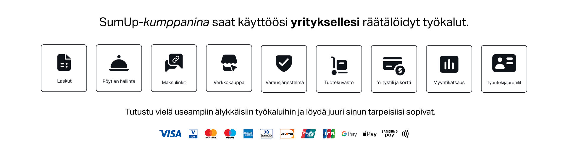 Me SumUpilla uskomme, että kaiken kokoisilla yrityksillä pitäisi olla käytettävissä helppoja ja edullisia maksuratkaisuja. Tuemme ylpeästi yli 4 miljoonaa yritystä maailmanlaajuisesti. Vaihda SumUpiin jo tänään muutamalla yksinkertaisella askeleella. Saat käyttöösi työkalut, joiden avulla voit keskittyä siihen yrityksesi kasvattamiseen. Valitse joko kiinteä kuukausisopimus tai maksa vain silloin, kun sinulle maksetaan.