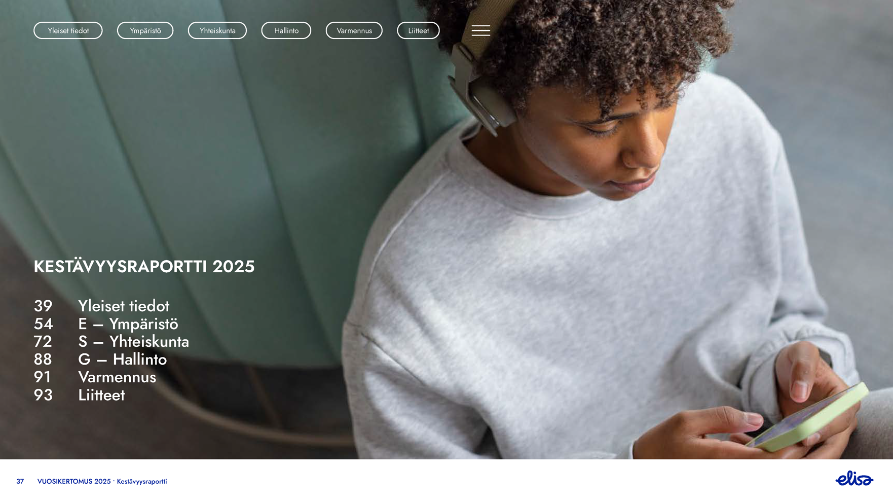 Kestävyysraportti vuodelta 2025 sisältää tietoja yritysten kestävyysraportointia koskevan direktiivin (CSRD) ja EU:n taksonomia-asetuksen mukaisesti ja se on laadittu Euroopan tilinpäätösraportoinnin neuvoa-antavan ryhmän (European Financial Reporting Advisory Group) julkaisemien eurooppalais-ten kestävyysraportointistandardien (ESRS) mukaisesti. Ympäristö-, Yhteiskunta- ja Hallintotapa-osioissa esitetyt kestävyyteen liittyvät seikat ja tiedot, arvoketjun alku- ja loppupää mukaan lukien, perustuvat Elisan tekemään kaksinkertaisen olennaisuuden arviointiin.
